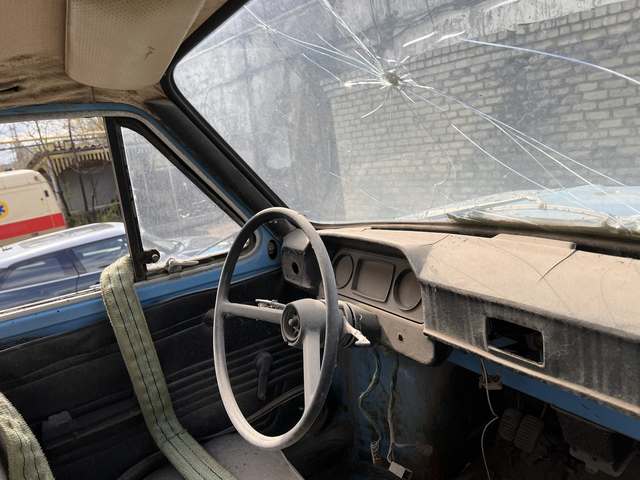 Це перший експонат, який довелося знімати краном із даху. Його стан складний: вибите скло, кузов пошкоджений і деформований вибуховою хвилею. Ймовірно, автомобіль стане донором для інших проєктів.