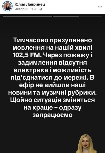 Из-за задымления и перебоев с электроснабжением радиостанция «Europa Plus Днепр» временно приостановила вещание. Об этом сообщила острудница Юлия Лавринец.