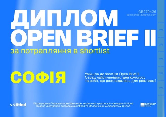Open Brief — це формат відкритого брифу для дизайнерів. Його організатори публікують технічне завдання, приймають роботи та обирають найсильнішу ідею, яку разом з автором допрацьовують та реалізовують в міському просторі. Загалом до шорт-листа конкурсу увійшли 7 робіт, а роботи трьох авторок (серед яких і Ліза) вже розмістили у салонах транспорту та на міських локаціях!