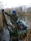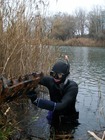 Несмотря на холодную погоду, под водой работало три водолаза. Они чистили дно водоема, как от мусора, так и от браконьерских сетей, местами перекрывающих канал от берега до берега. По словам участников акции, сети как раз и представляют наибольшую проблему – в нее попадает рыба, которая затем гниет, распространяя в воде трупный яд. Не обошлось и без личных потерь - один из водолазов сначала поломал ласты, а затем потерял дайверский нож.