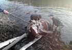За допомогою пожежного пояса, співробітники ДСНС вилучили бідолашну тварину із пастки.