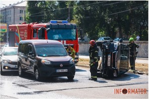 В Днепре на проспекте Хмельницкого Subaru столкнулась с двумя Fiat и перекинулась: движение затруднено